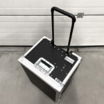 Plastikust metall raamiga, ratastega laadimiskast lukustava kaanega.
